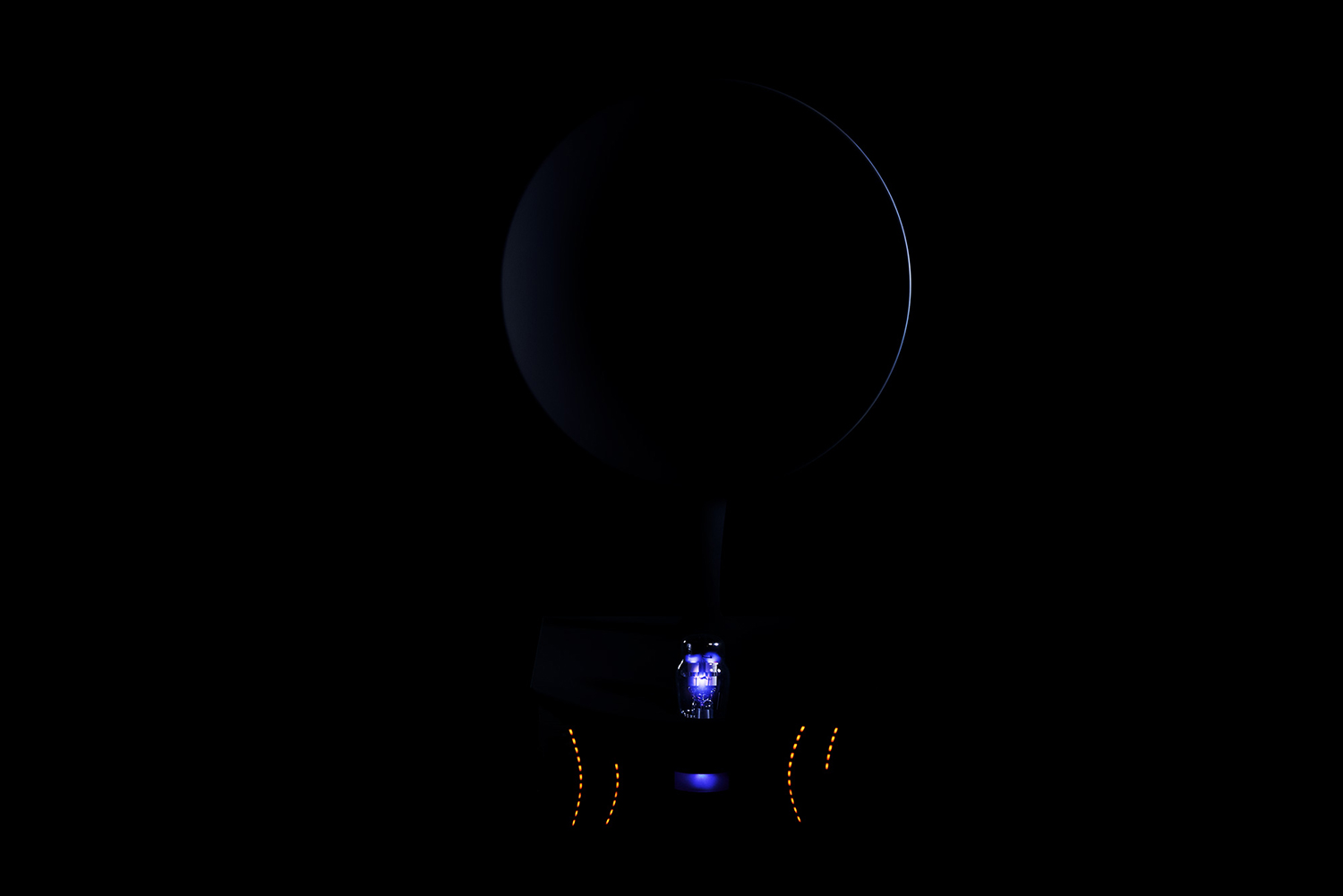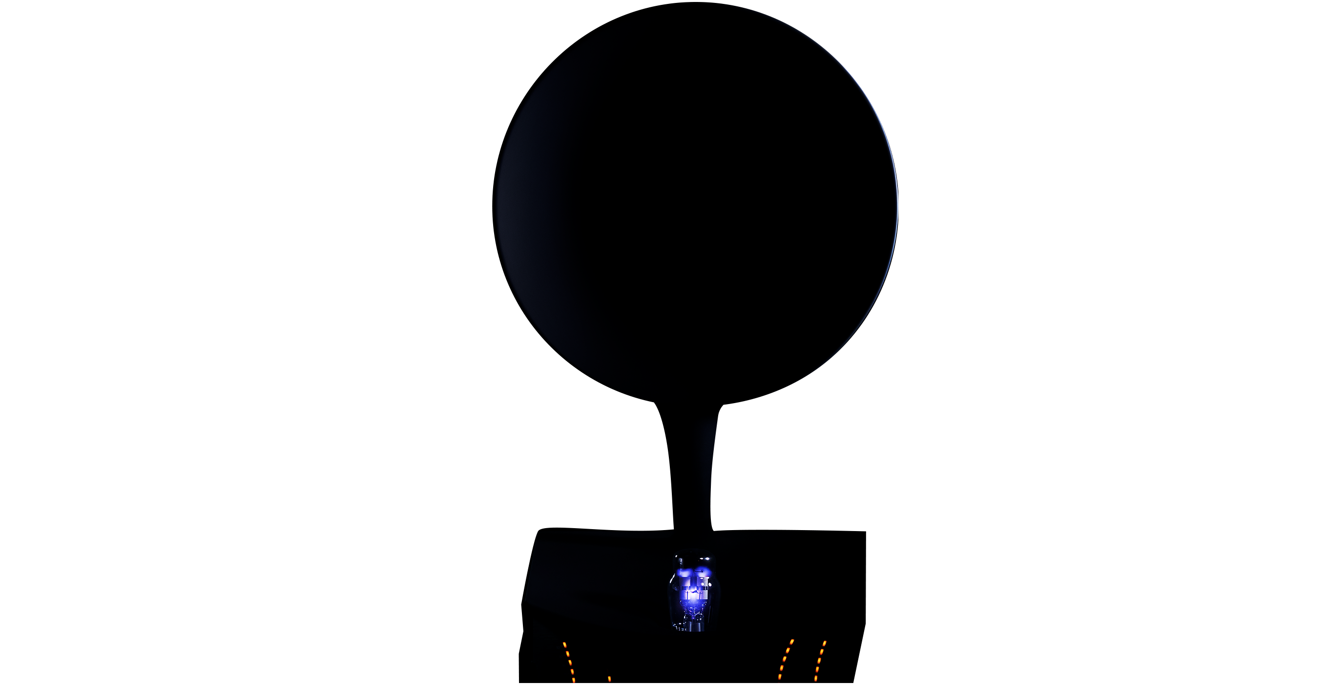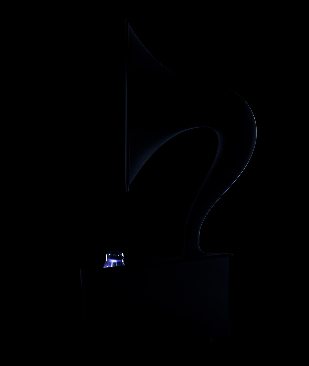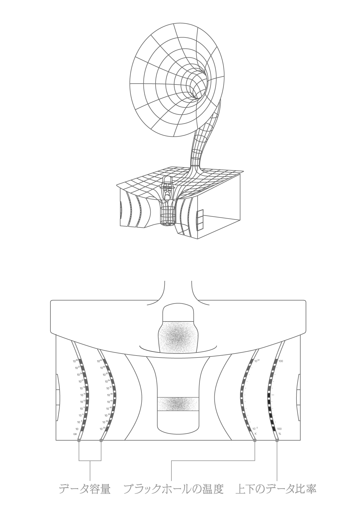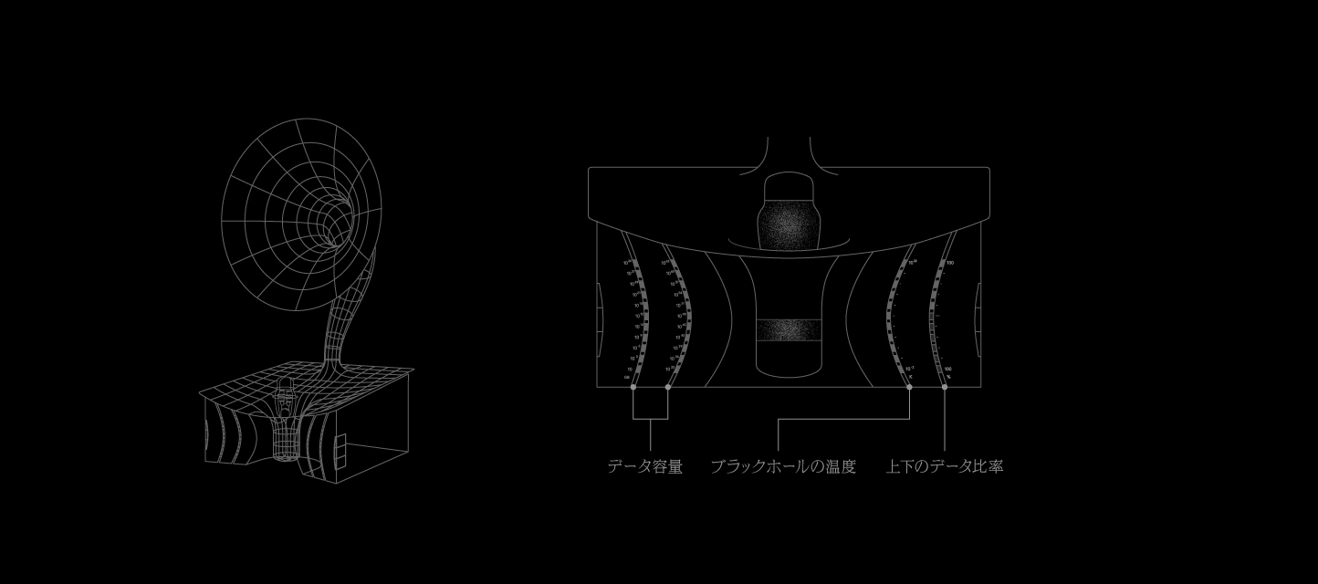 超小型の人工ブラックホールを搭載した蓄音機型の情報ストレージデバイスを空想してデザインされた模型です。このデバイスは、ブラックホールの時空の曲がりを模したホーン部分で音声を集め、ブラックホールに録音・再生する機能を有します。左側の2つのインジケータはデータ容量を表示します。右側のインジケータは、人工ブラックホールの温度と、上下のデータ比率を表示します(後述)。この模型は、最先端の研究にインスパイアされたUseless Prototyping Studioの第1弾の作品になります。私たちは「役に立たないプロトタイプ」を通じて、未知への好奇心が未来をつくる可能性を可視化し、科学と世界の新しい関係づくりを目指しています。