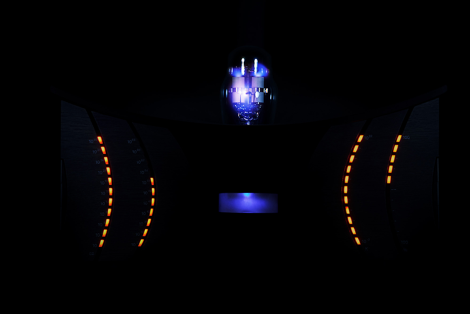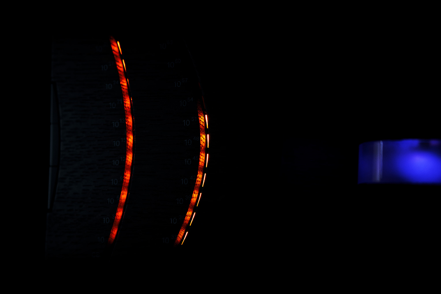 ずっと以前に保存したデータは内側の層に書き込まれているため、その読み出しの際には、外側の層から順番に蒸発させていき、内側の層を露出させる必要があります。このとき、蒸発させた外側の層のデータをどこか別の場所に保っておかないと霧散してしまい、情報ストレージとして役に立ちません。そのため、このデバイスの前面中央の下部の光っている部分にはもうひとつの人工ブラックホールが格納されており、蒸発させたデータをそこに一時保存する設計になっています。この上下2つのブラックホールのデータ比率を表すのが、1番右側のインジケータです。