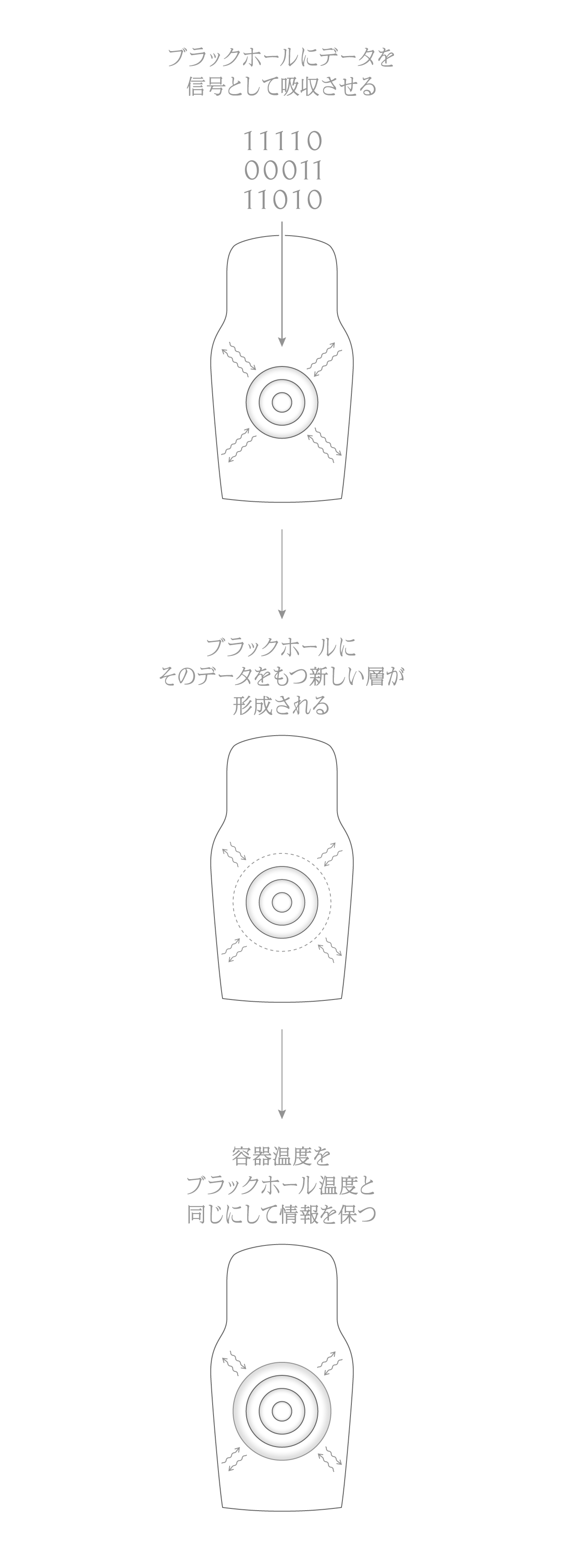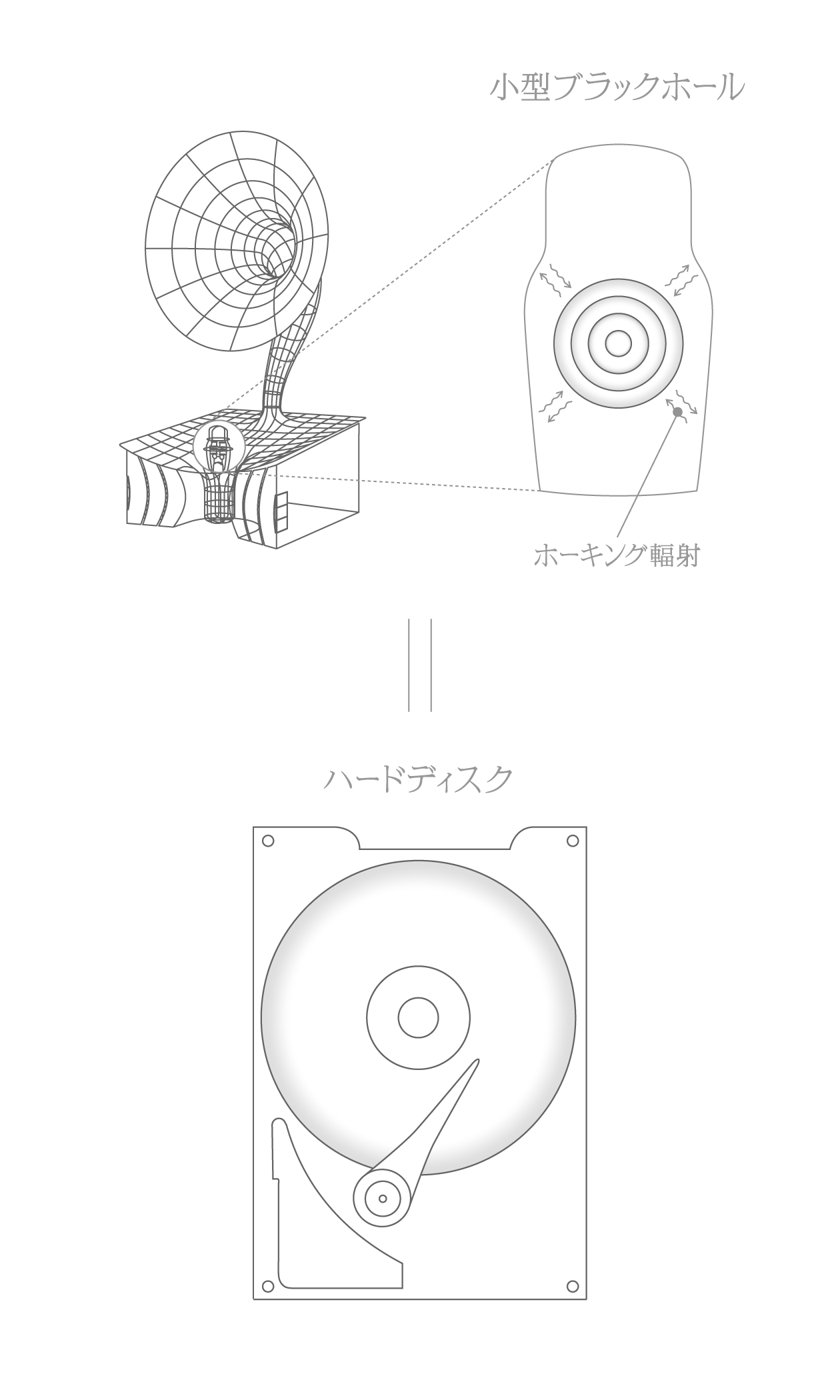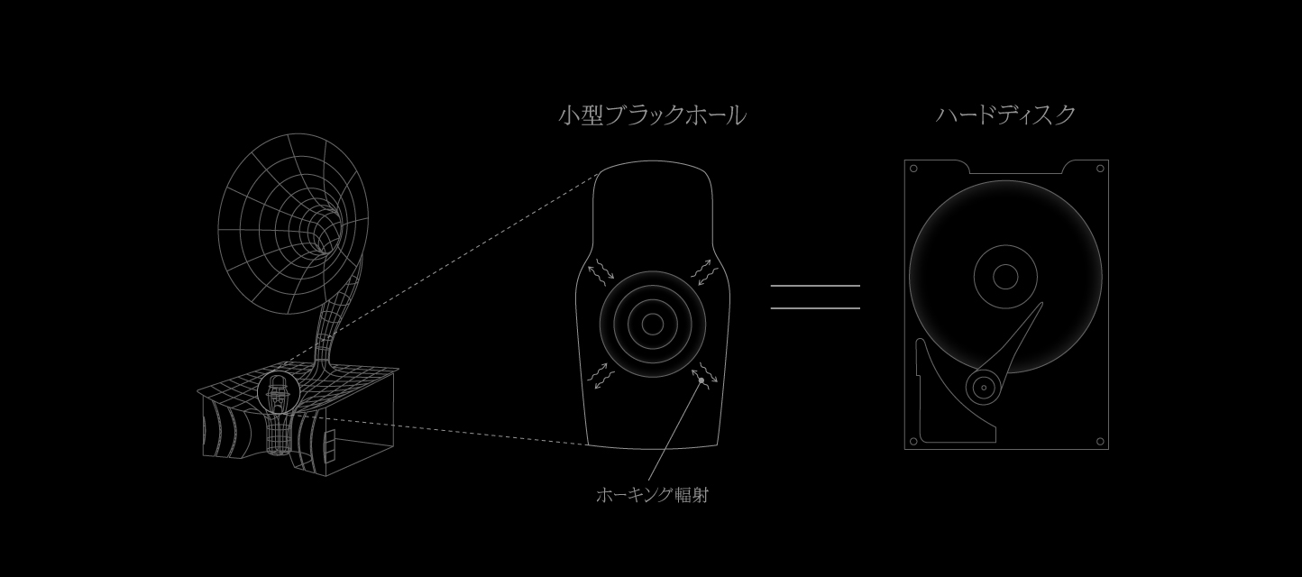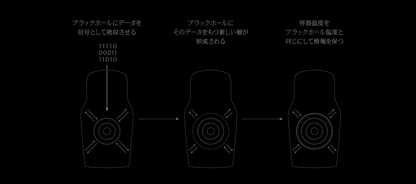 ブラックホールは内部に情報を取り込み、蒸発と共に外にその情報を放出すると予想されていますが、その仕組みは未だにわかっていません。その仕組みのひとつの可能性を示した最新論文にインスパイアされて空想・具現化したものが、Black Hole Recorderです。