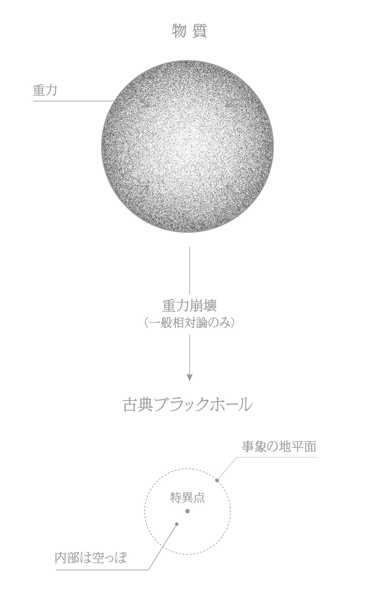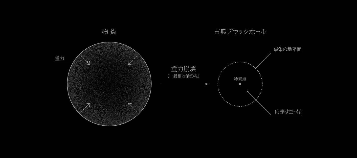 質量(エネルギー)を持つ全ての物質は万有引力により互いに引き合っています。そのため非常に高密度に集まった物質は、自身の重力に耐えきれずに内部に向かって潰れてしまいます(「重力崩壊」と言う)。その結果としてつくられる物体がブラックホールです。仮に一般相対性理論だけを考慮すると、物質は中心の一点にまで潰れ、光すら脱出できないほど重力が強い空っぽの時空領域が形成されます。これが量子力学を無視した場合に形成されるブラックホールです(「古典ブラックホール」と言う)。この領域から光が脱出できるかどうかの境界を「事象の地平面」と言い、中心の一点を「特異点」と言います。