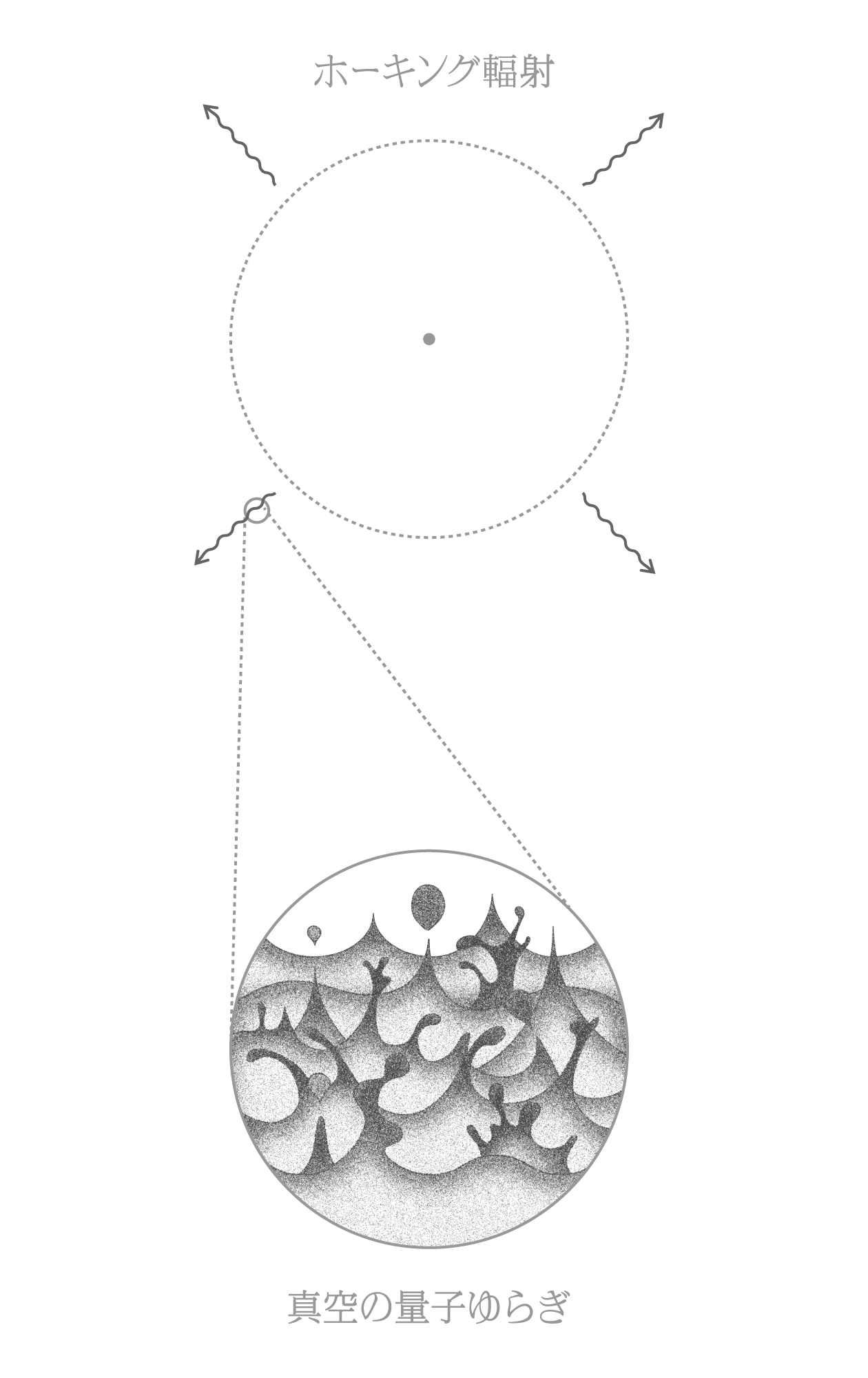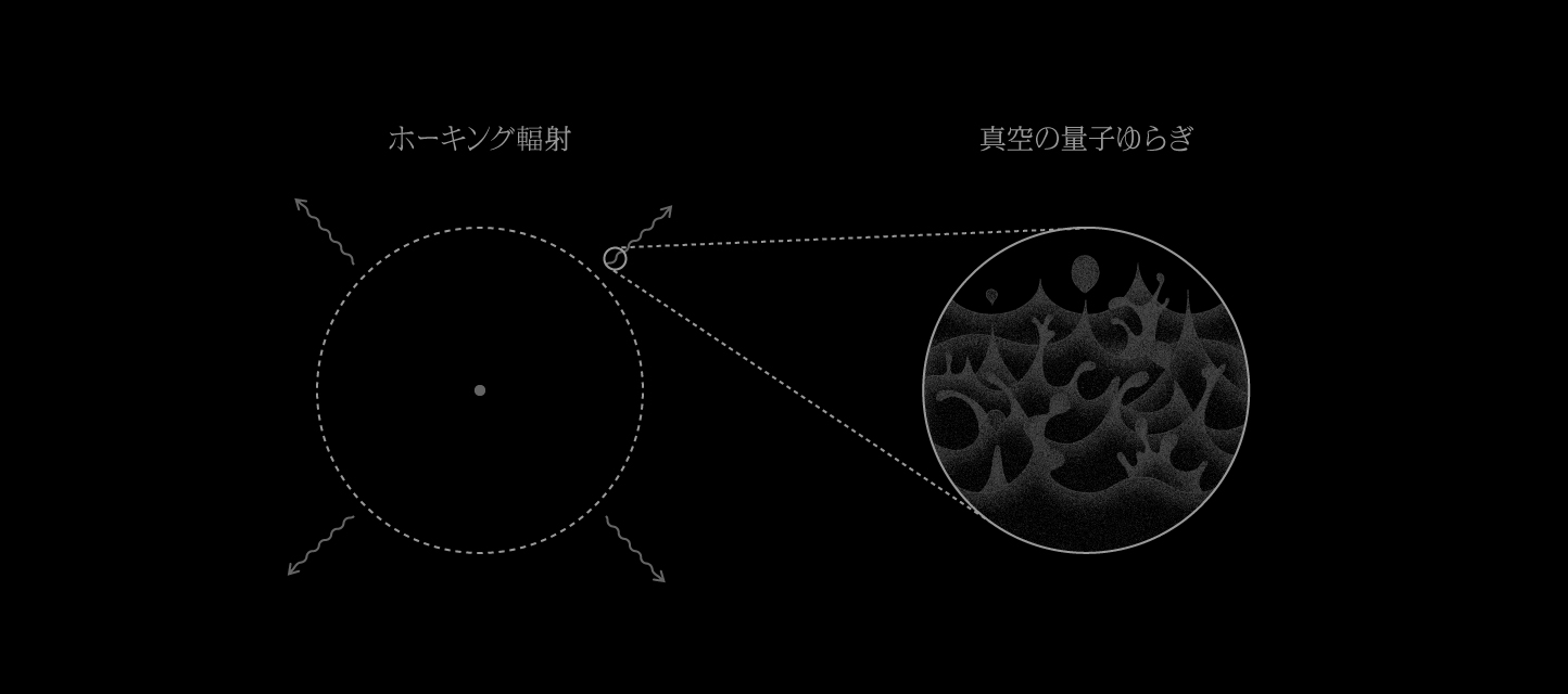 量子力学の世界では、一見何もない空っぽの空間であっても、真空が揺らいでいるため、時空が急に変動すると粒子がつくられます。1974年にホーキングは、ブラックホールの周囲の真空から温度を持つ光の粒子が生成され(「ホーキング輻射」と言う)、ブラックホールのエネルギーが徐々に減り、少しずつブラックホールが蒸発していくことを理論的に示しました。