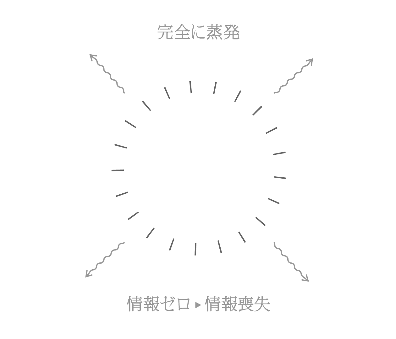もし古典ブラックホールがホーキング輻射によって完全に蒸発すると、そのもととなった物質の情報(例:その原子の種類など)が消えてしまいます。なぜならば、従来の考えによると、物質の情報は事象の地平面に捕えられて出て来られないままブラックホールが蒸発するにもかかわらず、外に放出されるホーキング輻射は周囲の真空に由来するため物質の情報を含まないからです。これは「情報は必ず保存する」という量子力学の原理に矛盾します(これを「情報喪失問題」と言う)。よって、従来の古典ブラックホールの描像だけでは、量子力学との整合が取れません。この意味で、量子力学と一般相対性理論の両方と矛盾しないブラックホールの正体は未だにわかっていません。
