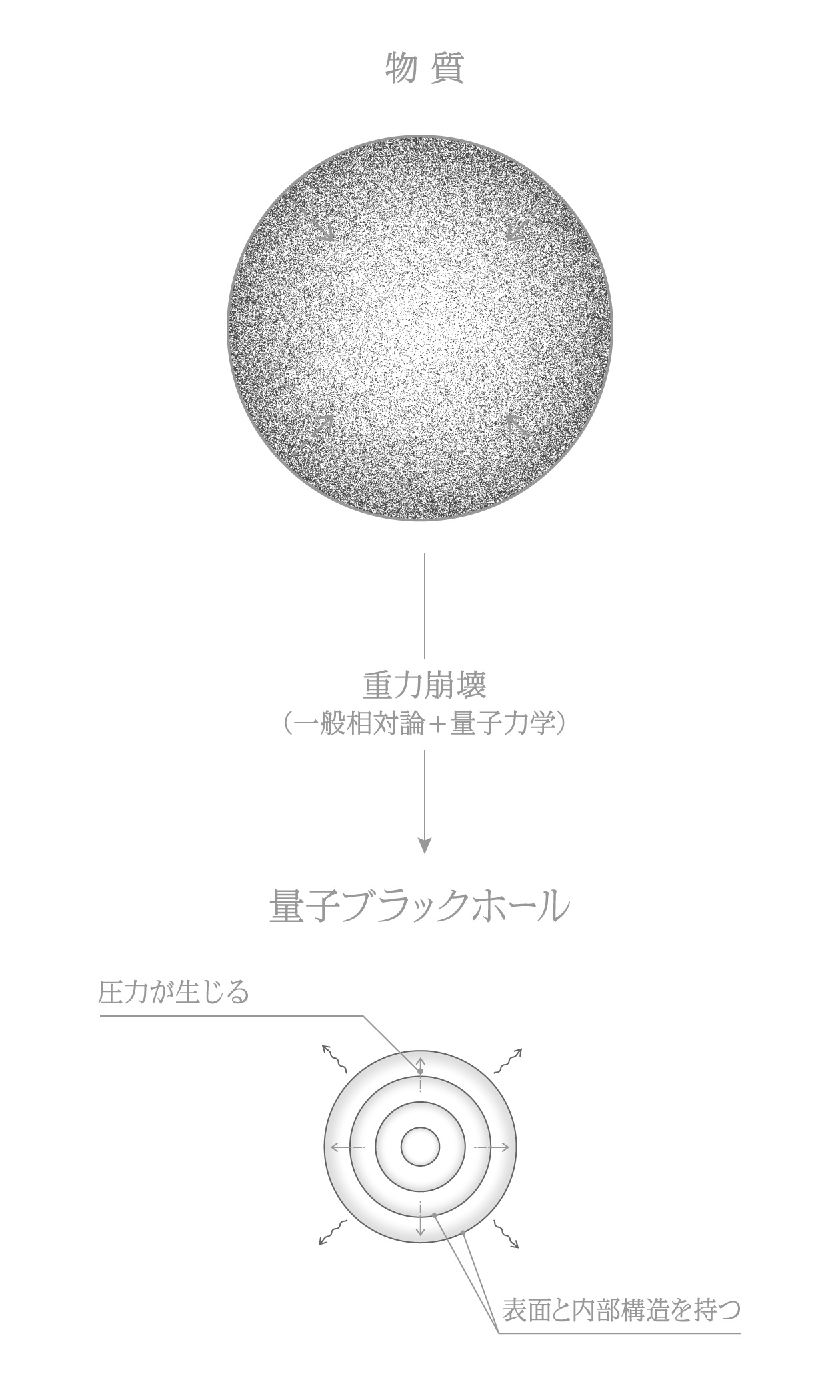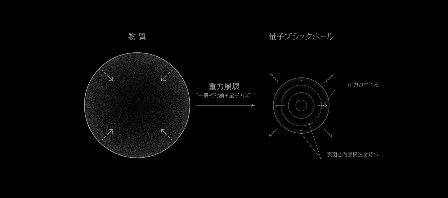この情報喪失問題を解決するかもしれないひとつの案を紹介します。物質が重力で潰れる際に量子力学の効果を最初から取り入れると、真空の強力な圧力によって物質が支えられ、事象の地平面の代わりに「表面を持つ高密度な物体」が形成されます。これが「量子ブラックホール」のひとつの可能性です。内部には物質があたかも玉ねぎのように積層して詰まっています。この高密度な物体の半径と、古典ブラックホールの事象の地平面の半径の差はわずかなので、外からはこの物体は古典ブラックホールのように見えます。